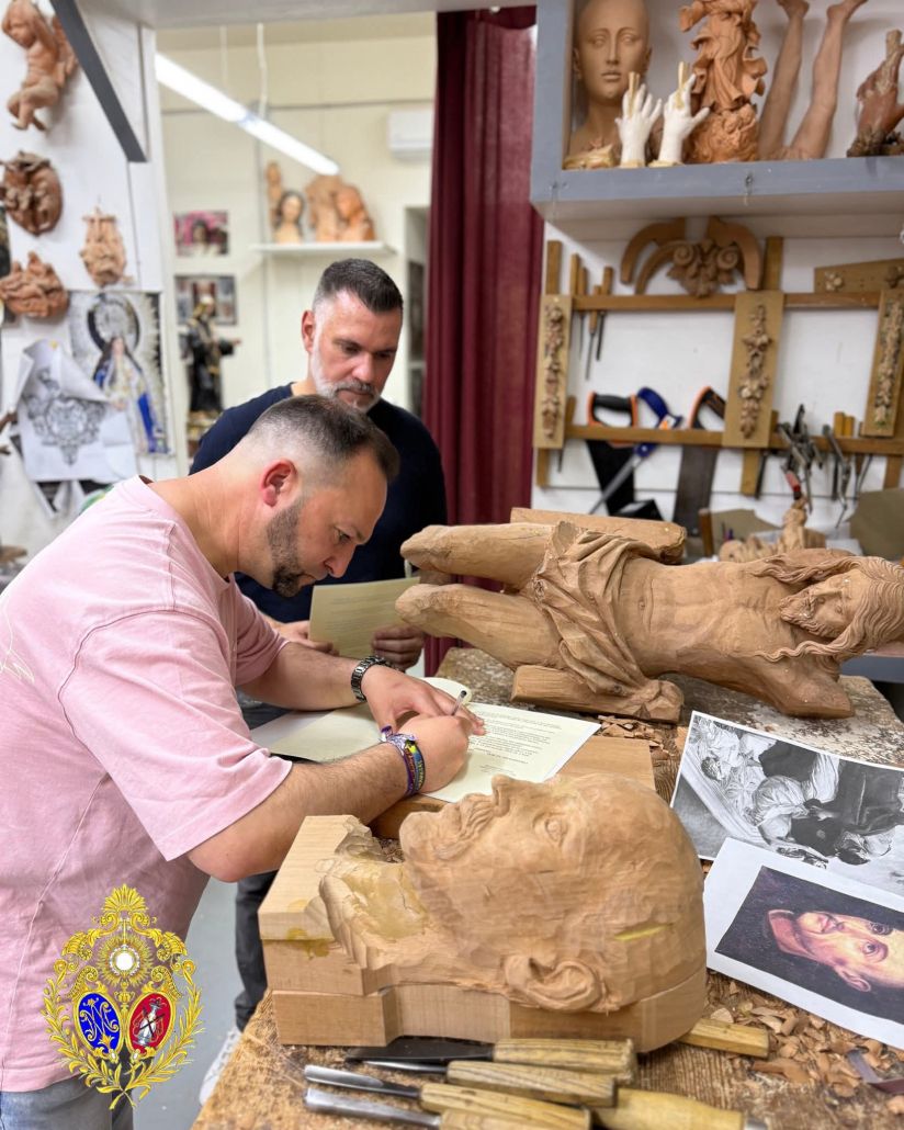 El motivo de este encuentro fue la firma del contrato para la ejecución de las nuevas cartelas del paso de misterio. Con este acuerdo, la hermandad continúa avanzando en el enriquecimiento de su patrimonio artístico, confiando la obra a un profesional de reconocida trayectoria para completar la ornamentación de sus andas procesionales.