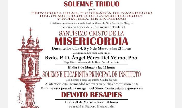 Los actos comenzarán con la celebración del Solemne Triduo, que tendrá lugar durante los días 4, 5 y 6 de marzo. Las celebraciones darán inicio a las 21:00 horas en la capilla de la hermandad. La ocupación de la cátedra durante estos tres días correrá a cargo del Rvdo. P. D. Ángel Pérez Del Yelmo, presbítero y capellán castrense de la Base Naval de Rota.