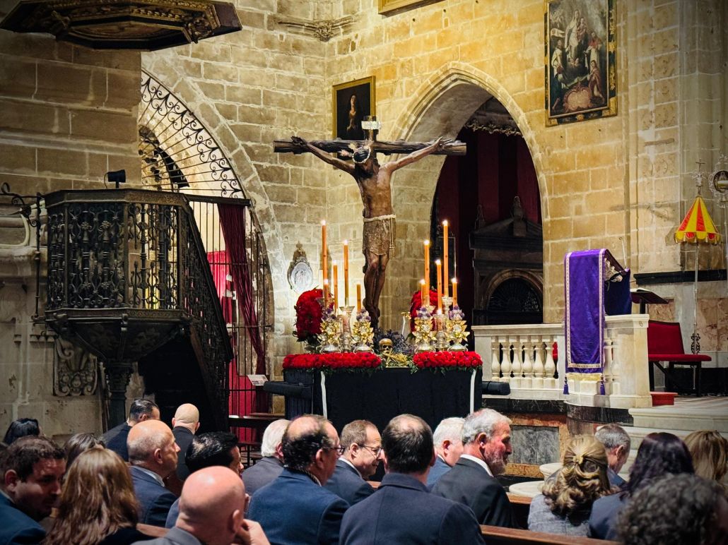 Cabe destacar que la Capilla Musical hizo estreno de la Misa para voces y capilla, dedicada expresamente a la Hermandad de la Veracruz de El Puerto de Santa María, compuesta por el maestro jiennense Francisco José Sánchez Sutil, quien se desplazó desde Jaén para asistir a este emotivo momento. Previamente, hicieron entrega oficial de las partituras en la Iglesia de San Joaquín, antes de la salida del traslado hacia la Basílica, en un acto cargado de emoción. A las 20:15 horas dio comienzo el rezo del Vía Crucis, que este año ha presentado variaciones en su itinerario, adentrándose con mayor profundidad en el Barrio Alto. El recorrido discurrió por San Juan, Zarza, Ganado, Pedro de Villa, Santa Clara, Rosa, Cervantes y Cielo, regresando finalmente a la parroquia de San Joaquín.