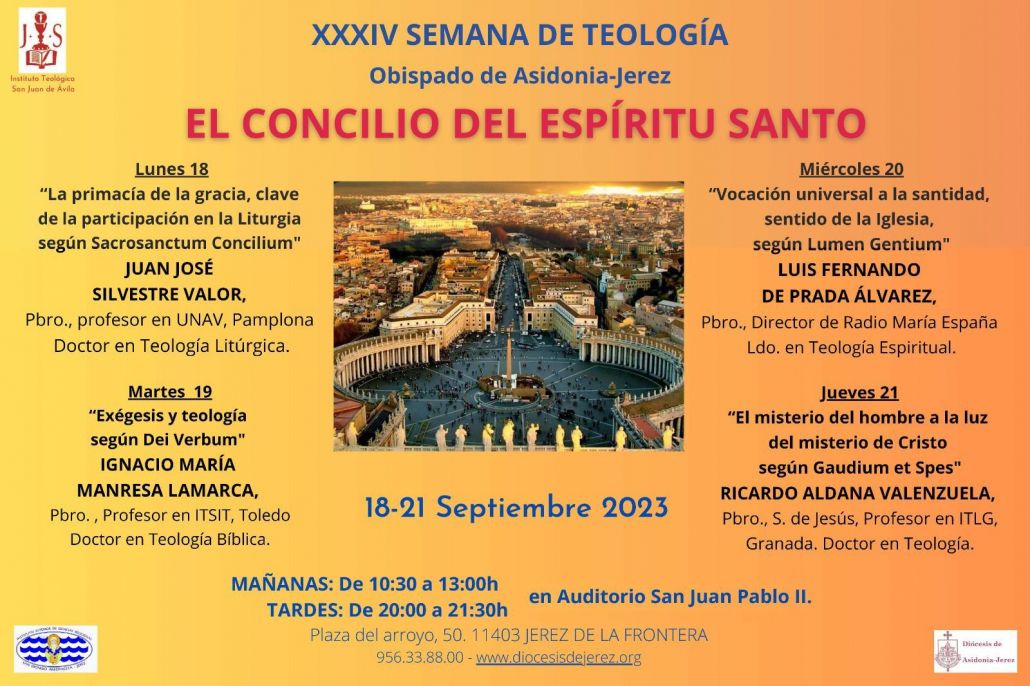 La Diócesis de Asidonia-Jerez organiza un año más, siendo ya la trigésima cuarta edición, la Semana Diocesana de Teología, llevando por título “El Concilio del Espíritu Santo“. Esta tendrá lugar del 18 al 21 de septiembre, en turno de mañana para sacerdotes y religiosos de 10:30 horas a 13:00 horasen el Auditorio San Juan Pablo II, y de tarde en el mismo lugar para los seglares de 20:00 horas a 21:30 horas. Cabe destacar que esta semana formativa está dedicada al Jubileo del año 2025, ya que como ha pedido el Papa Francisco, debemos retomar los textos fundamentales del Concilio Ecuménico Vaticano II.